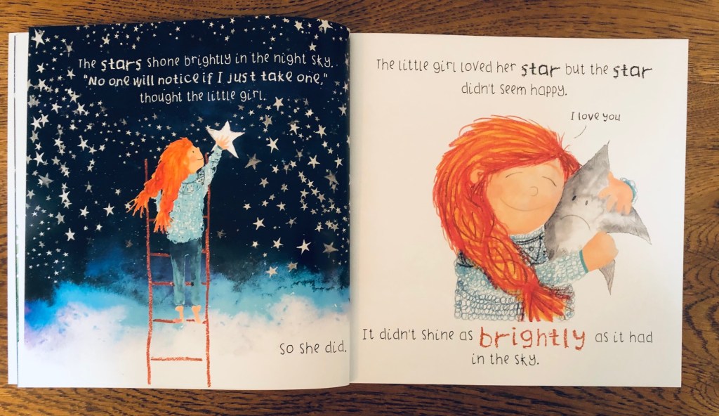 A little girl writes to Santa asking for a ladder that reaches to the stars. When she sees the stars, she canโt resist taking one to keep. But then the temptation grows and the little girl takes more and more stars until there are none left. Can Santa help her realise that the stars are there for everyone?