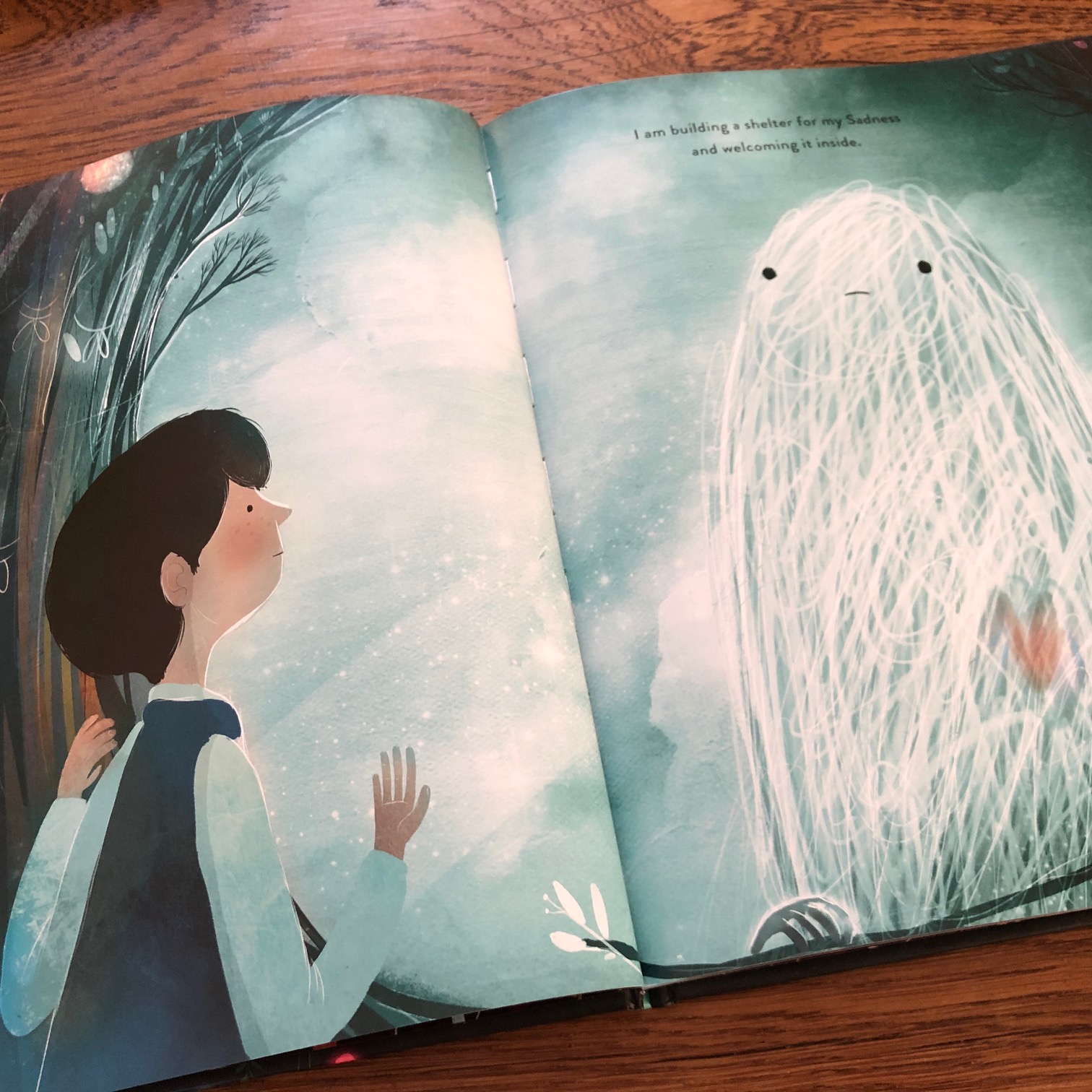 Throughout the book, we see how the boy allows Sadness to use the shelter to do whatever it needs to. Sadness can sit, lie down, be loud, be quiet. The boy spends time with Sadness whenever he needs, and they talk or cry or sometimes say nothing at all. David’s emotive illustrations portray the gentle relationship the boy has with Sadness.