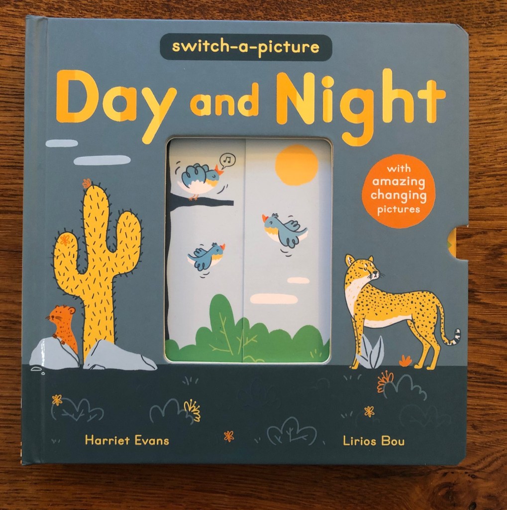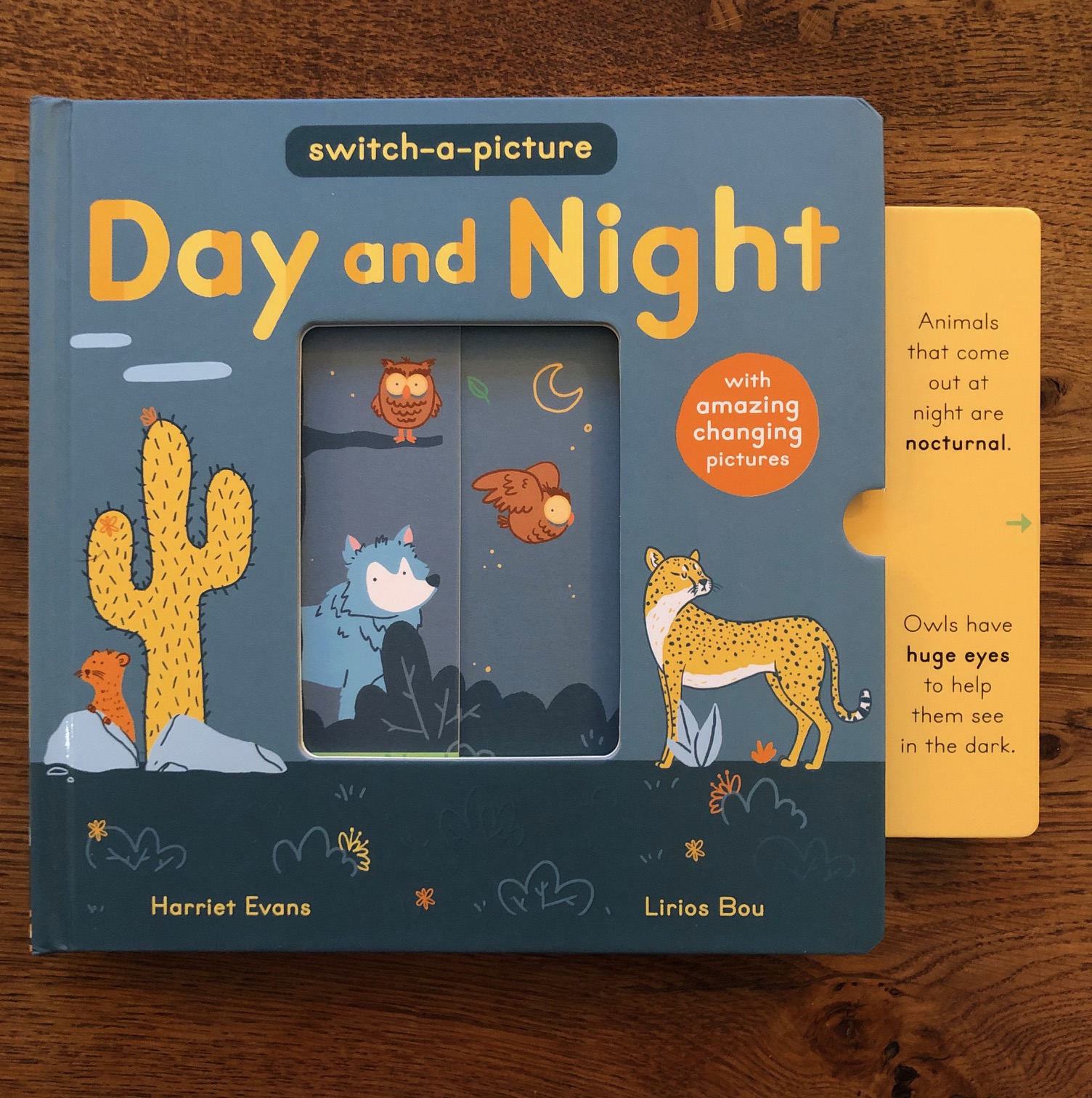 This book was an instant hit with both of my girls and me! It is part of Little Tiger’s Switch-a-Picture series and each page literally switches from day to night by the pull of a lever.