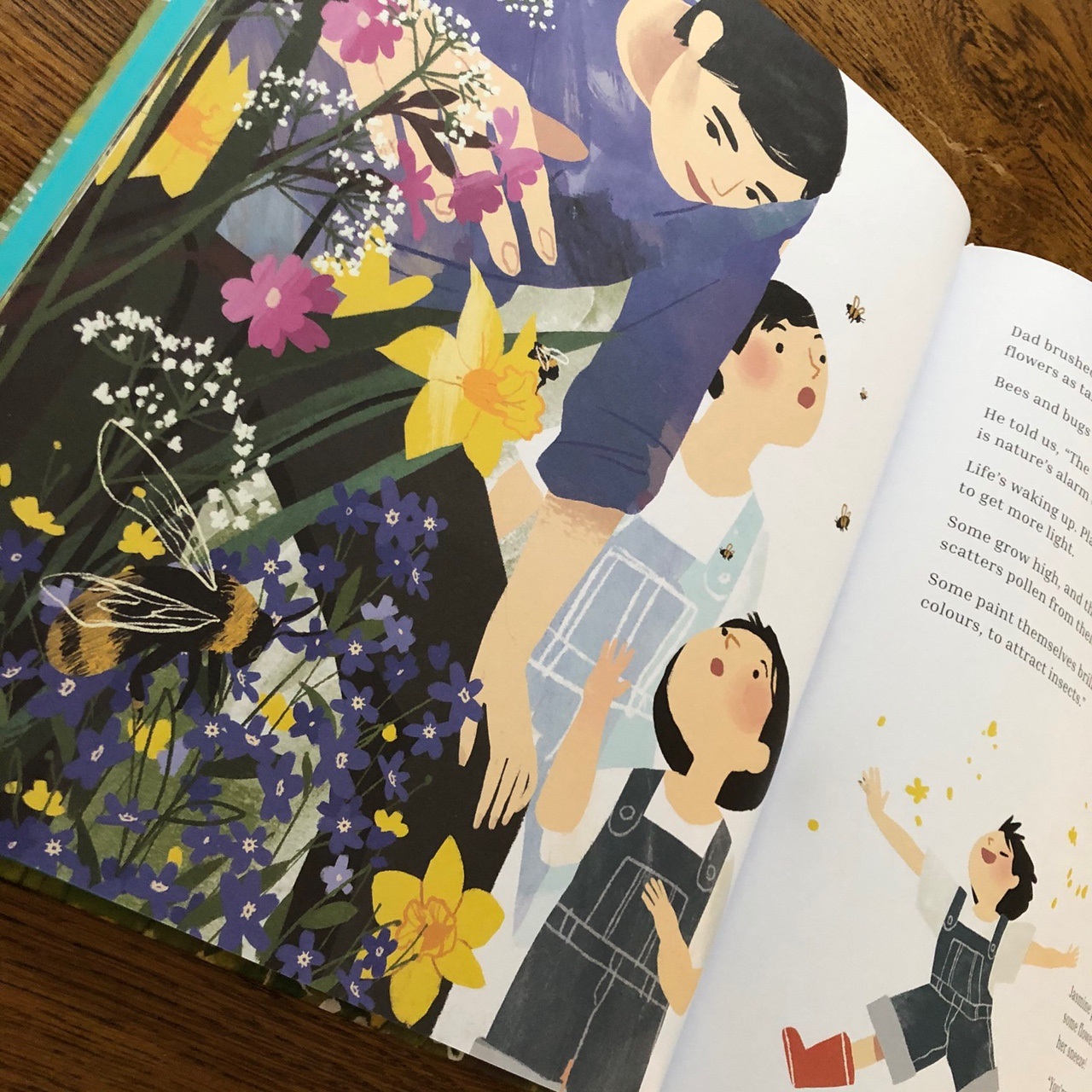 We read this book outside, if felt right as it’s all about nature, and we looked around the garden for the signs of Spring we could see. We didn’t see any tadpoles(!) but we did see a bee. A big bee, hurrying past, just as the book described! My daughter was so excited.