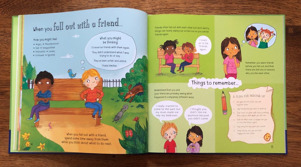 As a parent, I was pleased to have a guide I could refer to, to discuss tricky situations. We spent some time talking about the page on what do if you fall out with a friend. On the left hand side, it went through how the situation might make you think and feel. Then, on the right hand side, it gave you some pointers to keep in mind such as creating a plan for making up. There is also a useful glossary and guide for parents at the back of the book.