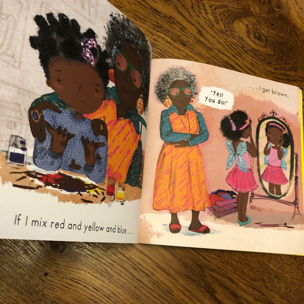 What happens when she mixes red, yellow and blue? She gets BROWN! Which is her colour. Oh my goodness this spread has such a powerful and wonderful message. I wish I had had a book like this when I was a child!